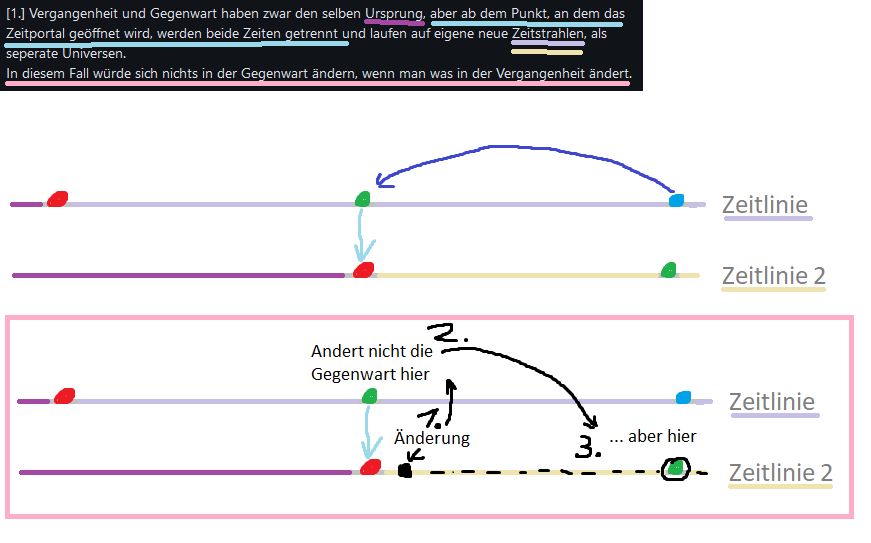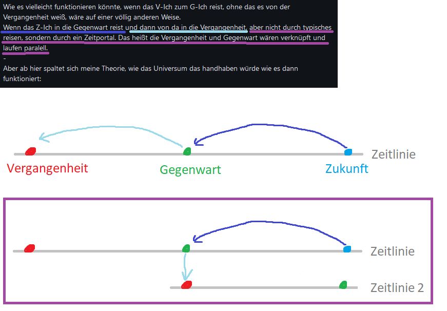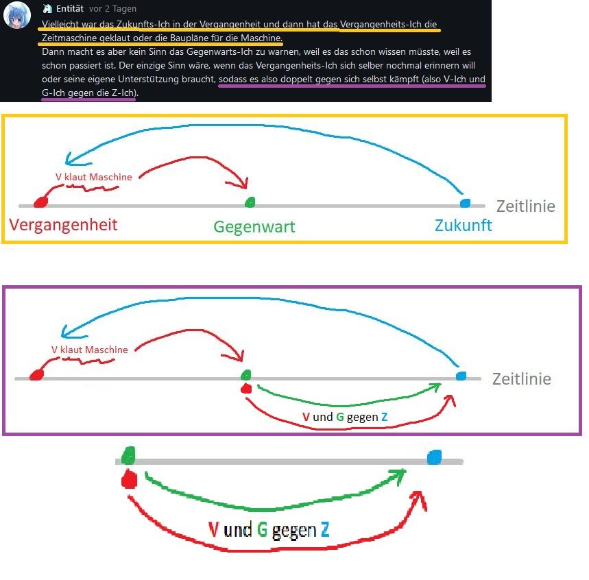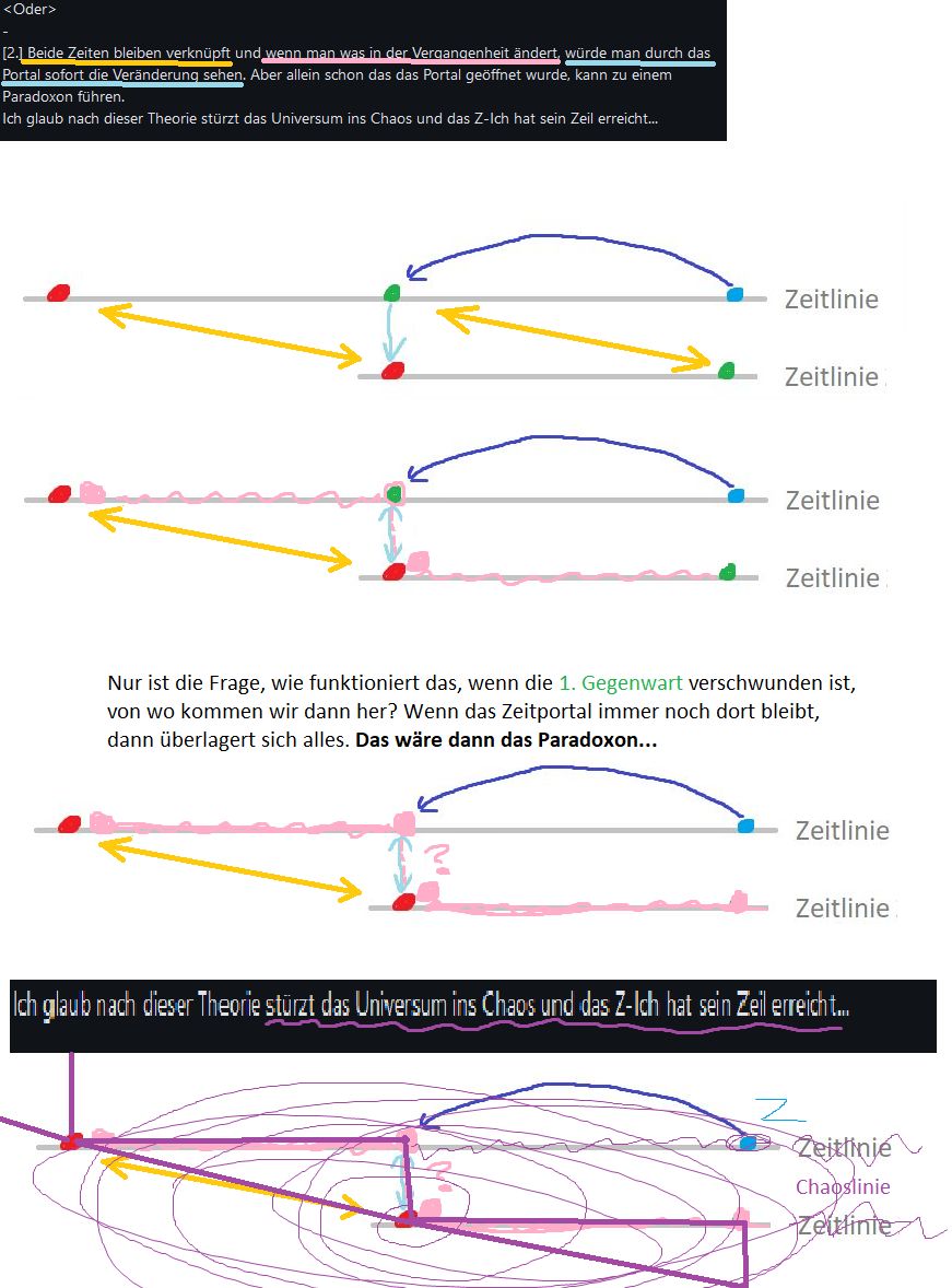 Vielleicht war das Zukunfts-Ich in der Vergangenheit und dann hat das Vergangenheits-Ich die Zeitmaschine geklaut oder die Baupläne für die Maschine. Dann macht es aber kein Sinn das Gegenwarts-Ich zu warnen, weil es das schon wissen müsste, weil es schon passiert ist. Der einzige Sinn wäre, wenn das Vergangenheits-Ich sich selber nochmal erinnern will oder seine eigene Unterstützung braucht, sodass es also doppelt gegen sich selbst kämpft (also V-Ich und G-Ich gegen die Z-Ich). - Wie es vielleicht funktionieren könnte, wenn das V-Ich zum G-Ich reist, ohne das es von der Vergangenheit weiß, wäre auf einer völlig anderen Weise. Wenn das Z-Ich in die Gegenwart reist und dann von da in die Vergangenheit, aber nicht durch typisches reisen, sondern durch ein Zeitportal. Das heißt die Vergangenheit und Gegenwart wären verknüpft und laufen paralell. - Aber ab hier spaltet sich meine Theorie, wie das Universum das handhaben würde wie es dann funktioniert: - <Entweder> - [1.] Vergangenheit und Gegenwart haben zwar den selben Ursprung, aber ab dem Punkt, an dem das Zeitportal geöffnet wird, werden beide Zeiten getrennt und laufen auf eigene neue Zeitstrahlen, als seperate Universen. In diesem Fall würde sich nichts in der Gegenwart ändern, wenn man was in der Vergangenheit ändert. - <Oder> - [2.] Beide Zeiten bleiben verknüpft und wenn man was in der Vergangenheit ändert, würde man durch das Portal sofort die Veränderung sehen. Aber allein schon das das Portal geöffnet wurde, kann zu einem Paradoxon führen. Ich glaub nach dieser Theorie stürzt das Universum ins Chaos und das Z-Ich hat sein Zeil erreicht... _ Das war deep... ._.