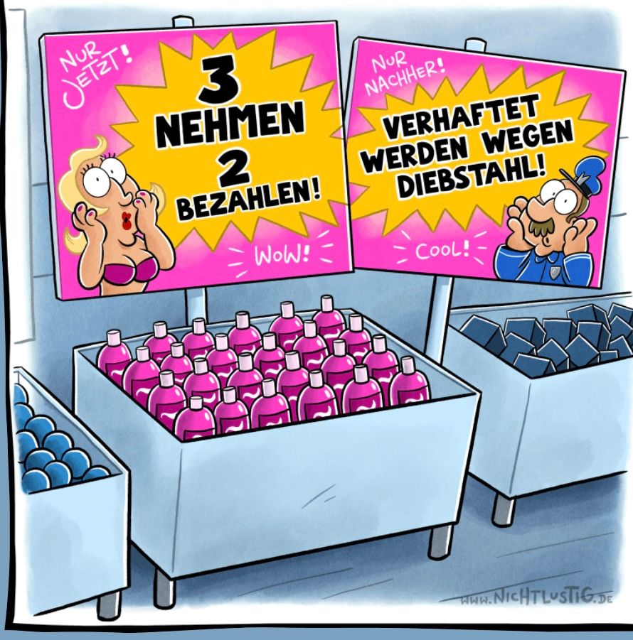 Die erste Kundin betritt den Laden: "Guten Tag, ich hätte gerne Waschmittel für Gardinen." Der Drogeriebesitzer stellt das Waschmittel und eine Flasche Fensterreiniger auf den Tresen und sagt: "Wenn Sie die Gardinen zum Waschen sowieso abnehmen, können Sie viel leichter die Fenster putzen." "Das ist wirklich eine gute Idee! Ich nehme beides!", antwortet die Kundin, bezahlt und geht.