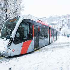 Der Bus hält an. Eine Frau mit ihrem Kind steigt ein.