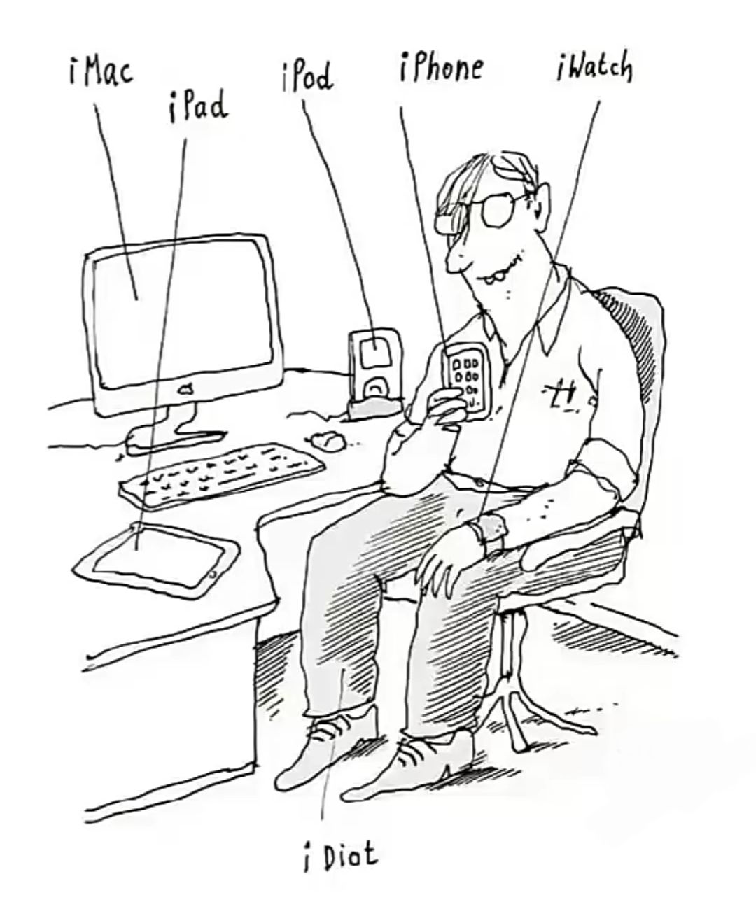 Der Alte, weitaus weniger begeistert, sitzt am Küchentisch, schüttelt den Kopf und brummt: "Ich verstehe es nicht... Ich verstehe es nicht, was die jungen Leute alle am iPod so toll finden..."