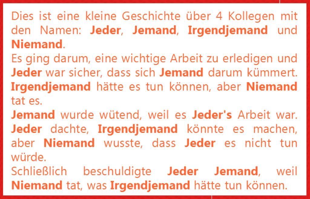 Da meldet sich der Hilfsarbeiter Luigi: "Kein Problem, ich machs." Er geht los und seine Kollegen fragen sich, ob das so eine gute Idee war. Nach einer Weile kommt Luigi zurück, übers ganze Gesicht grinsend und mit einem Kasten Bier auf der Schulter.