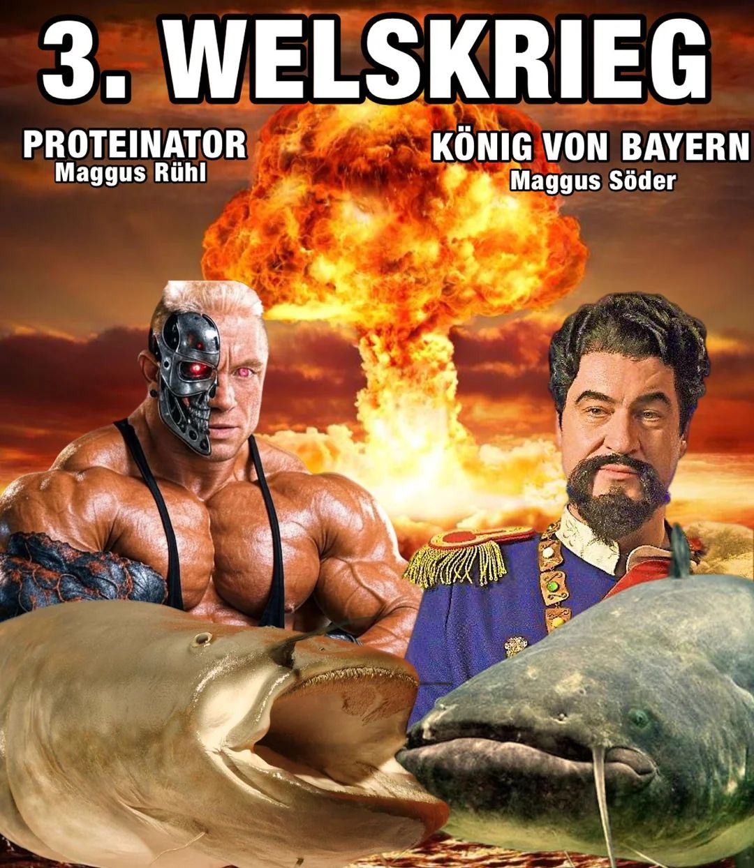 Ein humorvolles Bild, das eine Szene wie aus einem Katastrophenfilm darstellt. Im Hintergrund ist eine große, feurige Explosion zu sehen, die an eine Atombombenexplosion erinnert. Im Vordergrund stehen zwei große, muskulöse Männer. Links ist ein Bodybuilder zu sehen, dessen eine Gesichtshälfte wie ein Terminator-Roboter aussieht, darunter steht „PROTEINATOR Maggus Rühl“. Rechts daneben steht ein Mann mit Bart in königlicher Kleidung, darunter steht „KÖNIG VON BAYERN Maggus Söder“. Vor jedem der Männer schwimmt ein großer Wels (Katzenfisch). Oben im Bild steht der Titel „3. WELSKRIEG“.