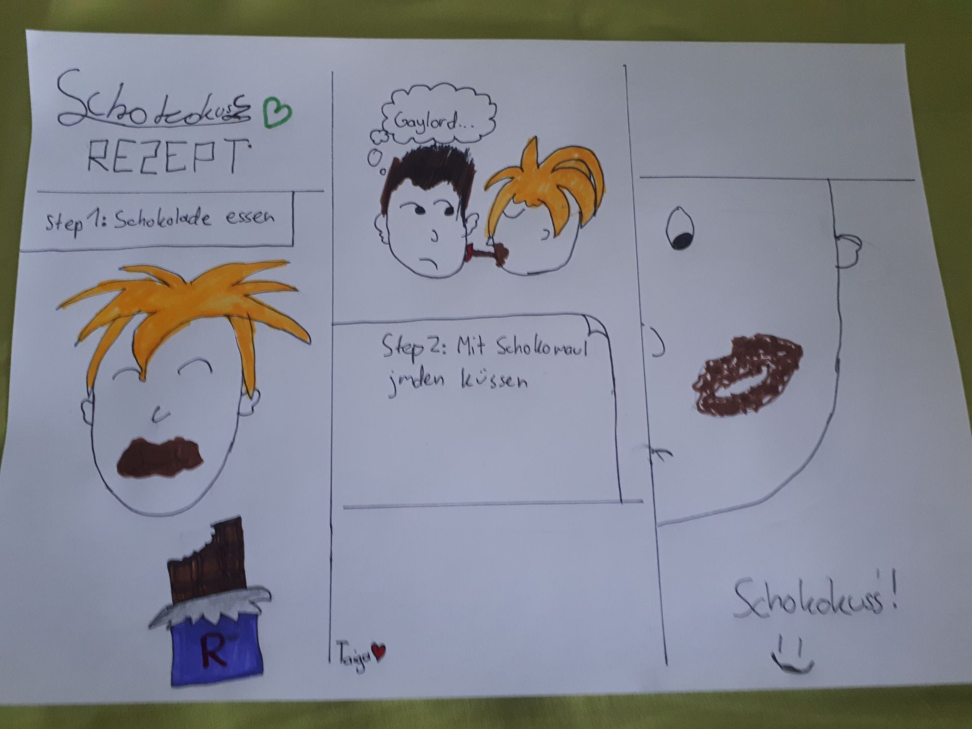 Ein handgezeichneter Comic, der ein Rezept für einen "Schokokuss" darstellt. Im ersten Panel isst eine Figur mit orangefarbenen Haaren Schokolade, wodurch ihr Mund verschmiert ist. Das zweite Panel zeigt diese Figur, wie sie einer anderen Figur mit dunklem Haar, die "Gaylord..." denkt, einen Kuss auf die Wange gibt und dabei einen Schokoladenabdruck hinterlässt. Im dritten Panel steht "Step 2: Mit Schokomaul jeden küssen". Das letzte, große Panel zeigt ein stilisiertes Gesicht im Profil mit braun verschmierten Lippen und dem Text "Schokokuss!" darunter, begleitet von einem Smiley.