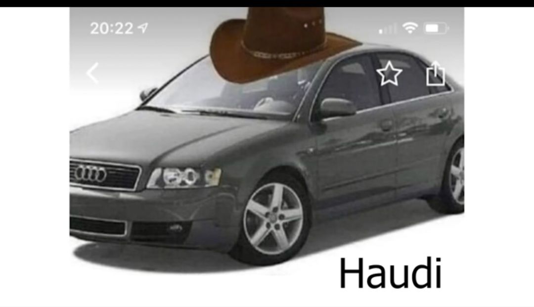Ein graues Audi Auto, auf dessen Windschutzscheibe ein brauner Cowboyhut liegt. Unten rechts im Bild steht das Wort "Haudi".