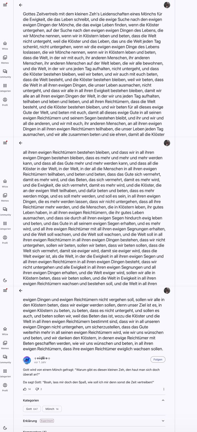 Der beste Titel bisher (musste zusammenfügen und ist jz unscharf, sry dafür) (s. https://schlechtewitze.com/witze/p/gottes-zeitvertreib-mit-dem-kleinen-zeh-s-leidenschaften-eines-moenchs-fuer-die-ewigkeit-die-das-leben-schreibt-und-die-ewige-suche-nach-den-ewigen-ewigen-din):