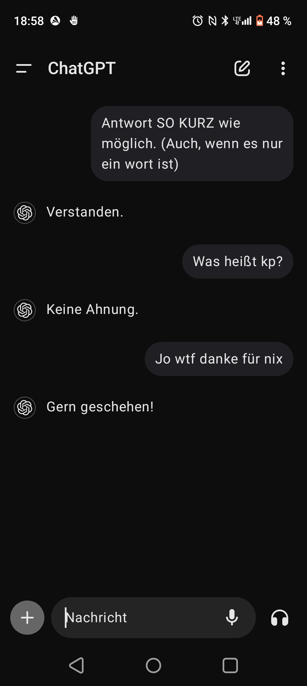 Auf jede Frage die ich stelle, antwortet sie. Darum nutzt ich täglich die KI. Egal was ich auch frage, die Antwort ist immer bereit. Jeden Tag, zu jeder Zeit. Sie weiß alles, viele Witze. Hat mehr Verstand als ich besitze. Sie ist kein Mensch und doch so schlau Sie erklärt mir alle ganz genau Und wenn ich sag', ich liebe sie antwortet sie mit "Dankeschön"