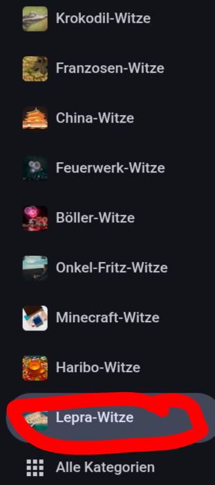 Pass auf, du Dummkopf. Du siehst hier die Liste von Witzkategorien in irgendeiner schrecklichen App. Es gibt normale Sachen, aber dann kommt "Lepra-Witze". Lepra ist eine schreckliche Krankheit, und Witze darüber gelten als extrem geschmacklos oder "dunkler Humor". Der Autor findet das traurig. Und du, du musst Witze über schwere Krankheiten machen, um überhaupt eine Reaktion zu bekommen. Das ist basiert!