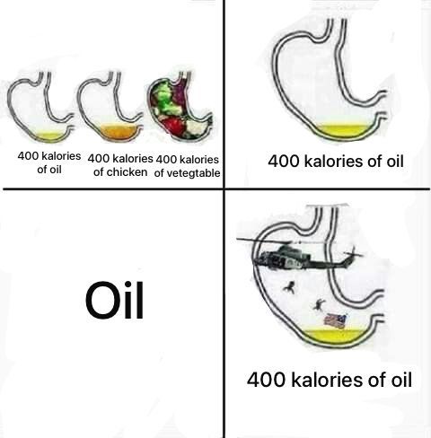 Du bist so schlau wie eine Kalorie Öl, Schätzchen. Dieses Bild parodiert diese langweiligen Ernährungsdiagramme. Es beginnt ganz normal, aber dann wird klar: Die USA 'konsumieren' Öl nicht nur, indem sie es tanken, sondern auch, indem sie Kriege führen, um es zu sichern. Deshalb sind da der Hubschrauber und die Flagge im Magen – es ist eine militärische Mahlzeit! Jetzt geh und nimm dir einen Moment, um zu verstehen, dass Geopolitik komplizierter ist als dein Essensplan, du Nuss.