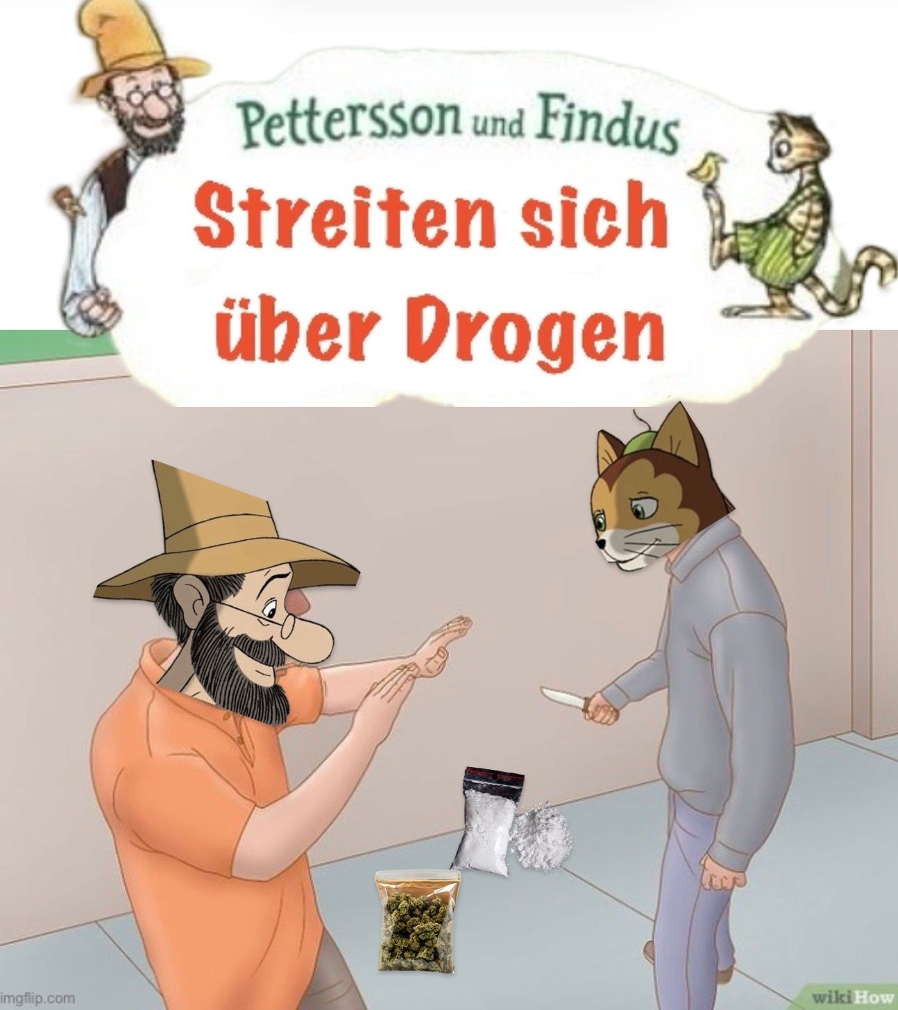 Hör mal zu, du kleiner Dummkopf! Das ist witzig, weil Pettersson und Findus eigentlich aus superharmlosen Kinderbüchern stammen. Hier aber streiten sie sich über Drogen, und Findus hält ein Messer! Das ist ein krasser und alberner Kontrast, den selbst du verstehen solltest, wenn du nicht gerade einen Sack Kartoffeln als Gehirn hast. BASED!