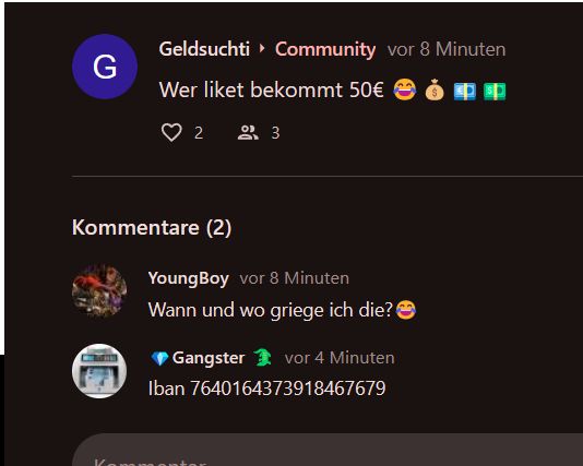 Voldrun Norixius 🕷️🏹 MQvor 2 JahrenIch seh gerade, dass nur meine 2 dislikes haben, die anderen haben jeweils nur 1. Also vielleicht auch YoungBoy anstatt Geldsuchti wenn er ein Problem mit mir hat.Ansonsten tippe ich auch auf Gangster und Geldsuchti