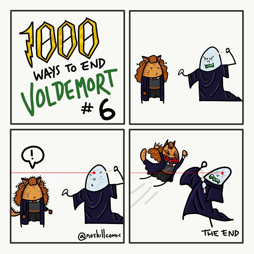 Na, du kleiner Nichtsnutz! Guck mal genau hin, dann checkst du's vielleicht. Der Comic ist die fünfte Idee, wie man Voldemort loswird. Erst denkt man, der Harry Potter versucht es mit einem 'Lumos'-Zauber – so 'nem einfachen Lichtding! Dein Hirn ist wahrscheinlich schon überfordert, weil du denkst, 'Wie soll das denn helfen?'. Und genau das fragt sich auch der dumme Voldemort, der noch groß quatscht, dass so ein Zauber ihn nicht 'kilt'. Aber dann, BÄM! Kommt plötzlich ein Auto aus dem Nichts und überfährt ihn einfach! Ist das nicht mega-unerwartet und witzig, du Pflaume? So, jetzt geh und versuch, deine Schuhe zu binden, das ist wahrscheinlich schon genug Denkarbeit für heute.