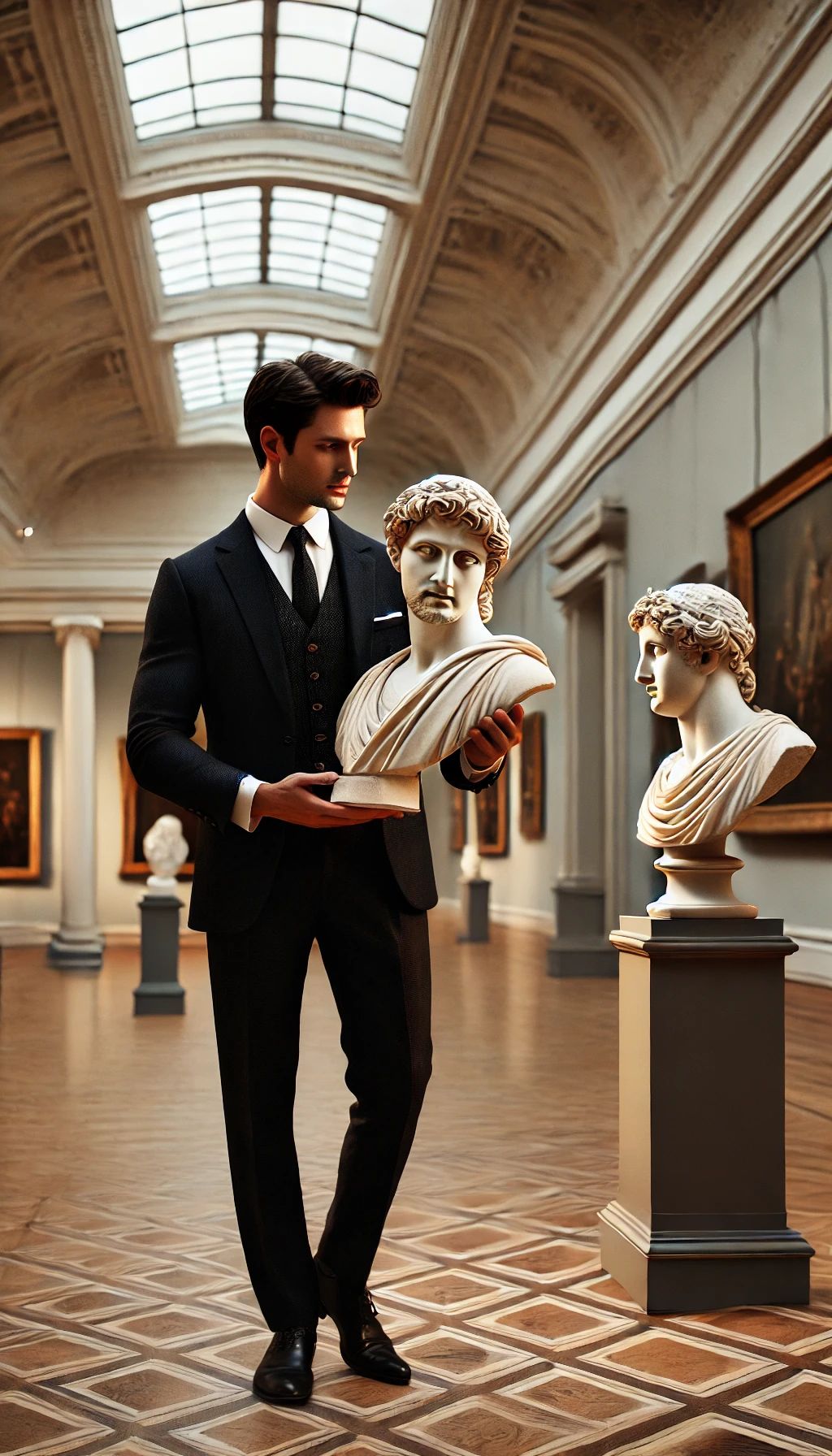 Ein Vater steht mit seinem Sohn im Museum vor einer Skulptur, die eine unbekleidete wunderschöne schlanke griechische Göttin darstellt.