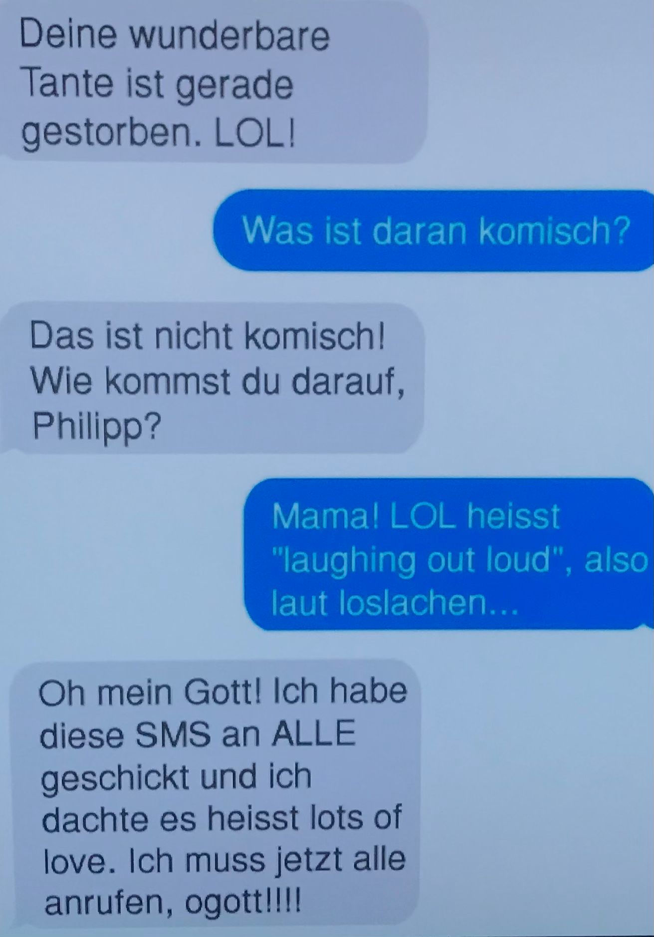 Tante Trude kommt zu Besuch. Die kleine Steffi fragt sie freudestrahlend: “Liebe Tante, ich habe dir extra ein Bonbon aufgehoben, möchtest du es haben?“- „Gern“, freut sich die Tante über das süße Geschenk. „Schmeckt's?“, fragt Steffi, während die Tante das Bonbon lutscht. „Ja, sehr!“ Steffi schüttelt den Kopf: „Dann versteh‘ ich nicht, warum Bello es vorhin ausgespuckt hat!“