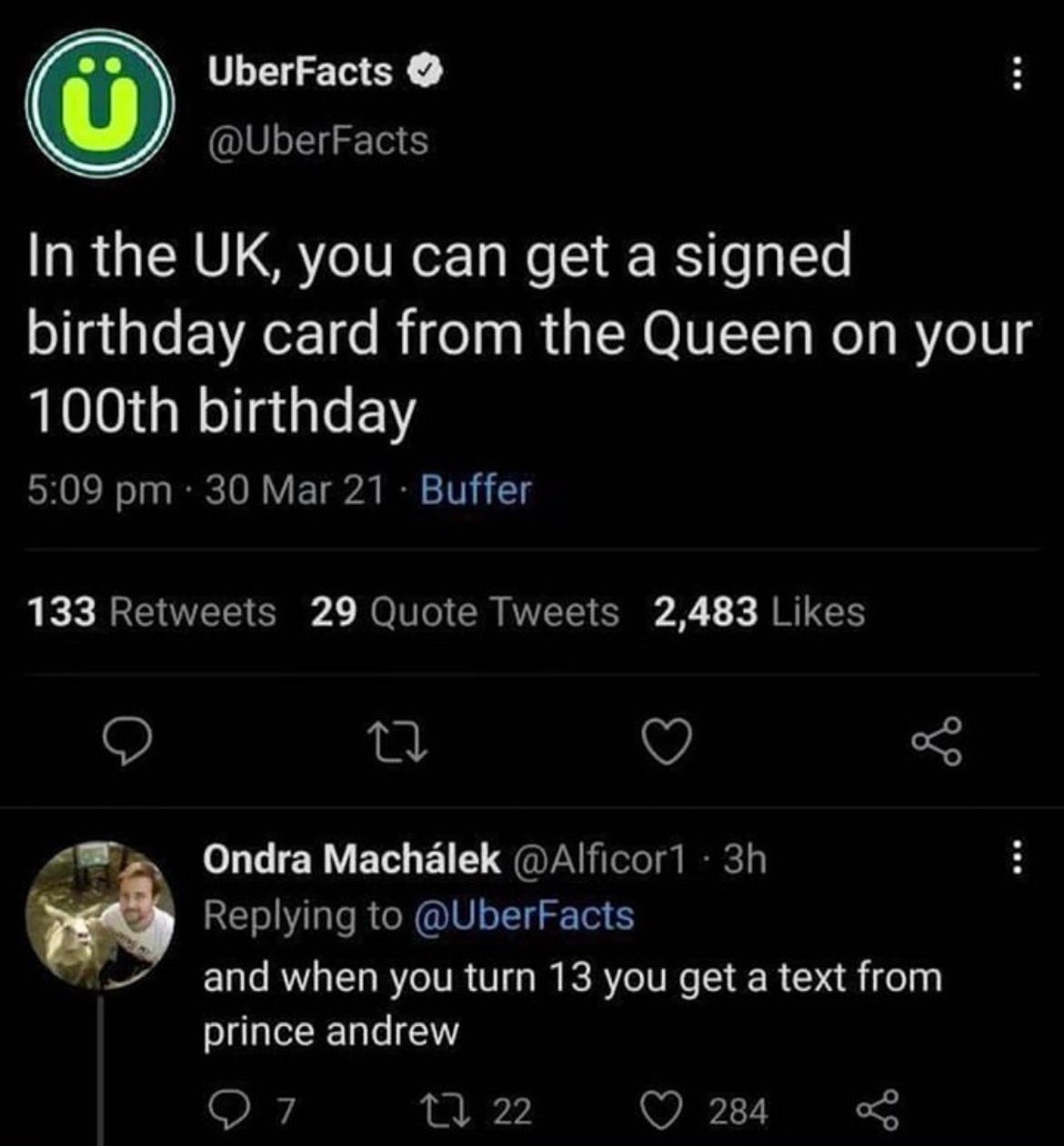 Der Präsident eines Landes ist bei Prince Charles zu Besuch. Sie machen eine Rundfahrt mit der Kutsche. Da plötzlich furzt ein Pferd und es stinkt furchtbar. Prince Charles entschuldigt sich: „Oh, sorry!‟ Darauf der Präsident: „Nicht schlimm. Aber ich dachte zuerst, es sei das Pferd gewesen.‟