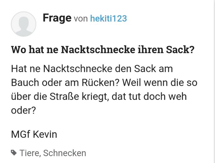 Nach 2 Jahren klingelt es an der Tür. Er macht die Tür auf. Da steht die Schnecke und sagt: "Was sollte die Aktion?"