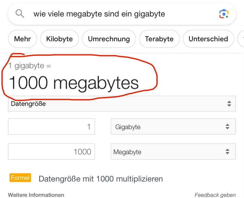 Bei anderen Einheiten (Gramm, Meter, Volt usw.) stimmt das... Aber Bytes sind eine Ausnahme. Dort ist tatsächlich 1024 der Umrechnungsfaktor, nicht 1000. Das liegt daran, dass in der Computertechnik alles binär ist, also Potenzen von 2. (Also 2, 4, 8, 16, 32, 64, 128, 256, 512, 1024 usw., immer verdoppelt halt) Deshalb kann man 1000 nicht als Umrechnungsfaktor nehmen, also nimmt man das, was am nächsten dran ist, nämlich 1024.