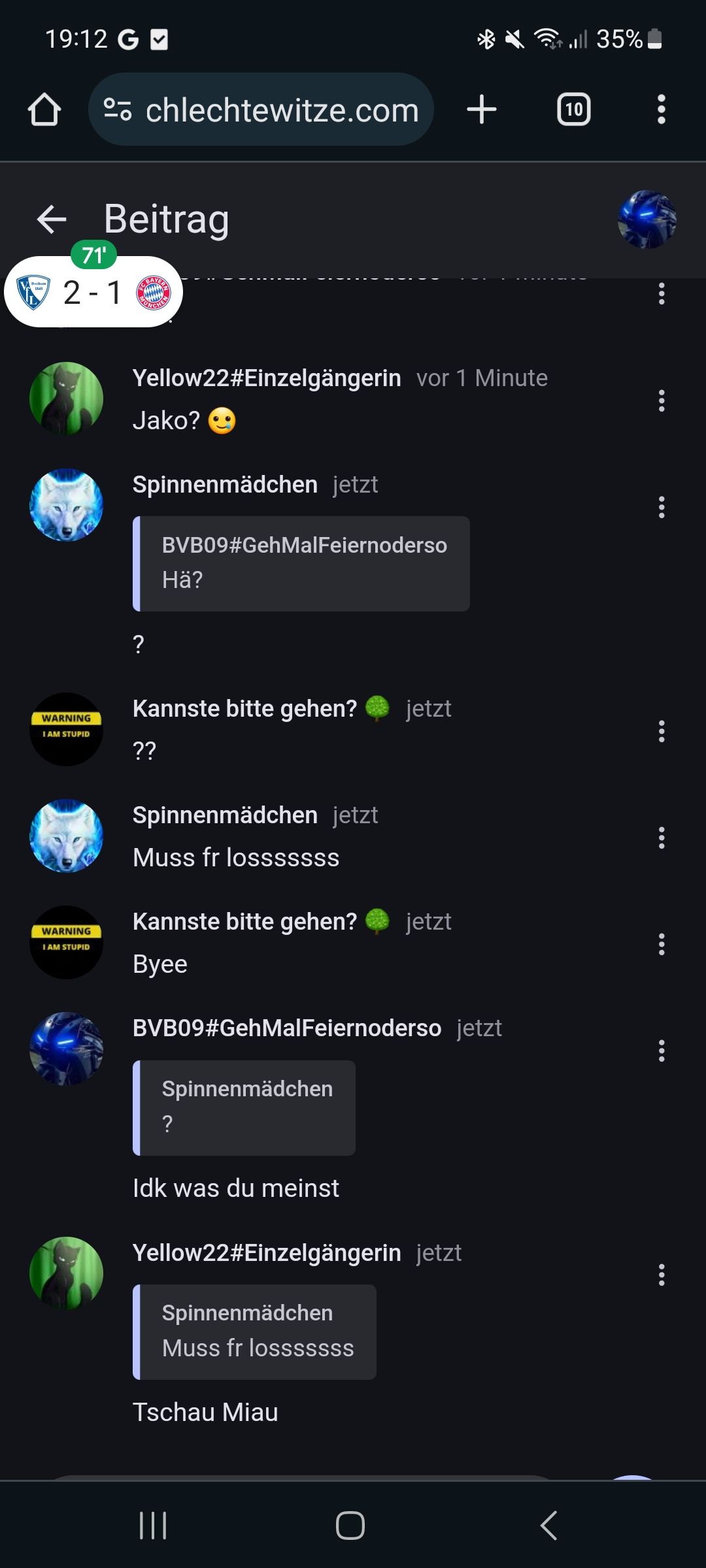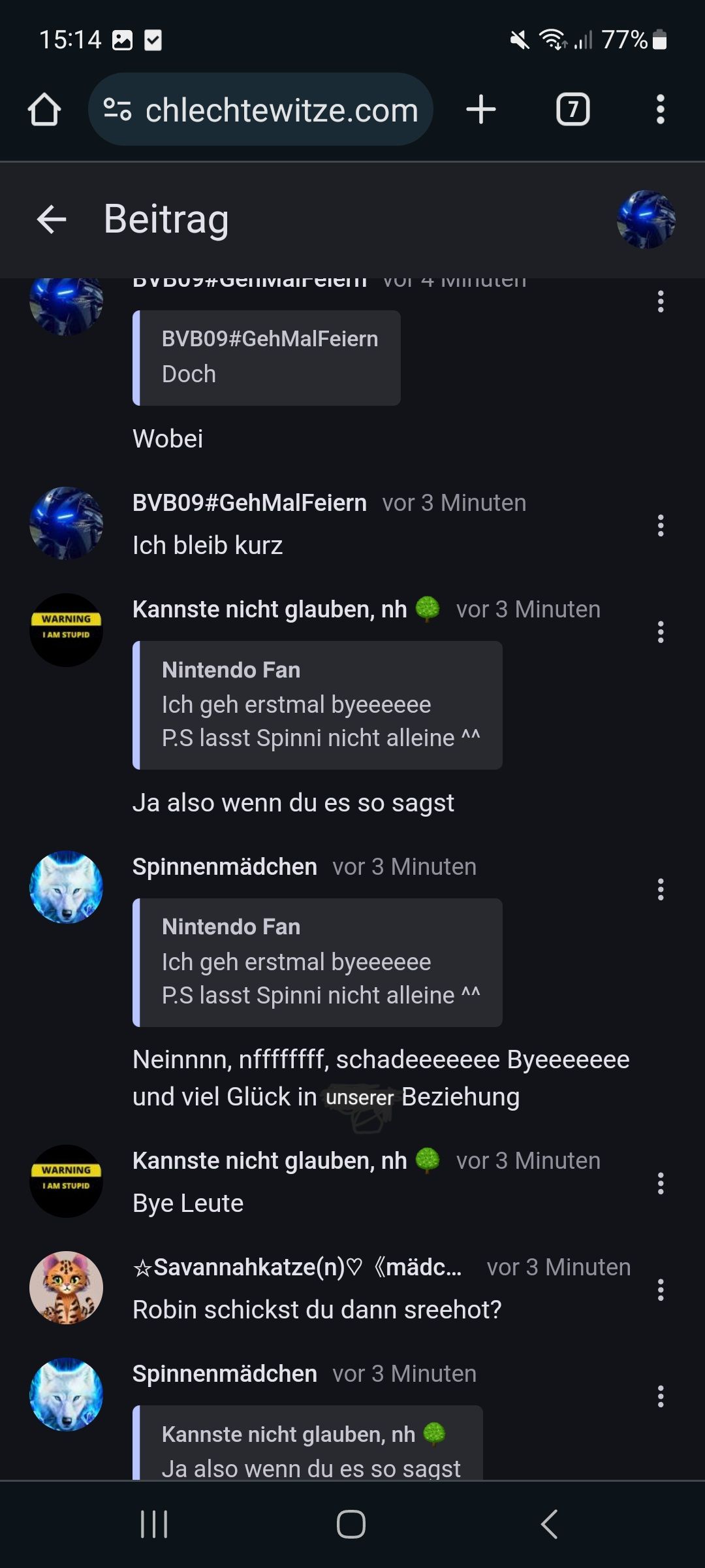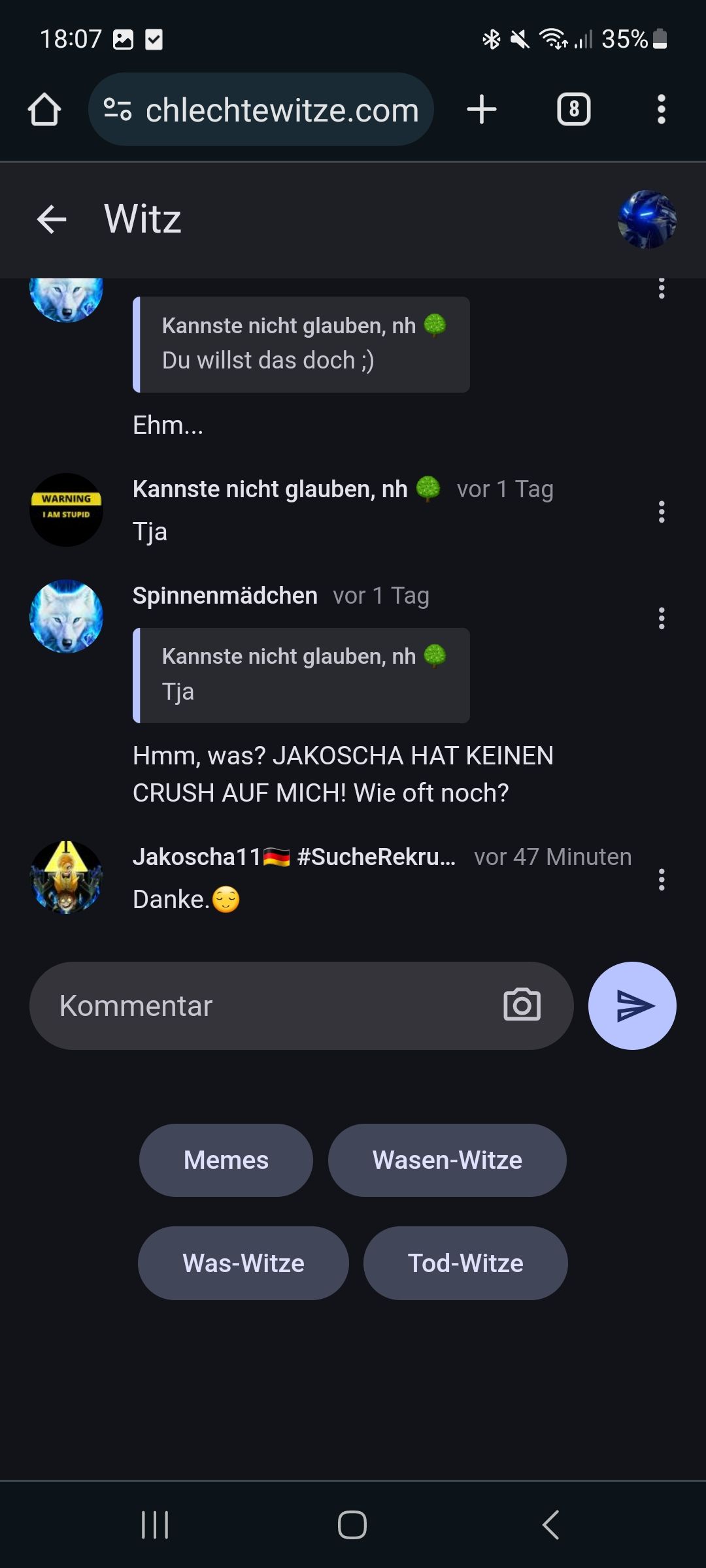Wir können dann hier hin gehen, falls das hier dann voll ist :schlechtewitze.com/witze/60d226d4f8343e264fe9b53d/chatwill-das-auch-mal-ausprobieren