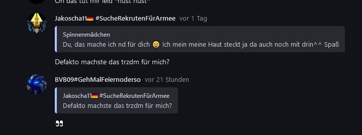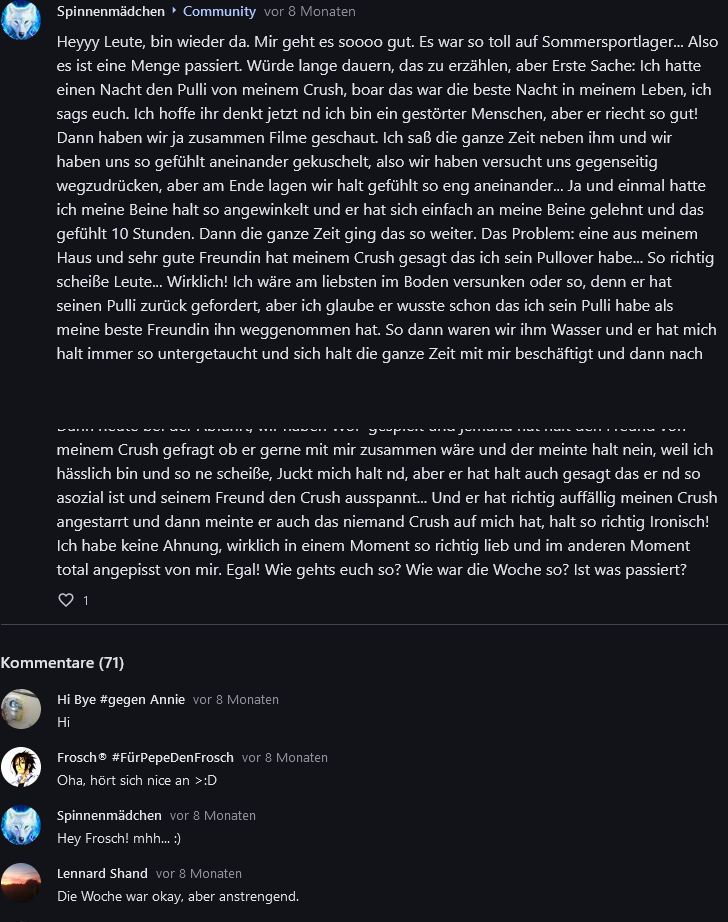 Aber klar juckt es mich, dass du weg warst (oder bist..). Es tut halt auch weh, dass hier jz "Anonym" statt "Spinnenmädchen" steht. Aber auch, als ich den Beitrag gesehen hab. War so mit das schlimmste, was ich hier (oder eig generell im Leben) erlebt hab. Wollte ich mal kurz sagen