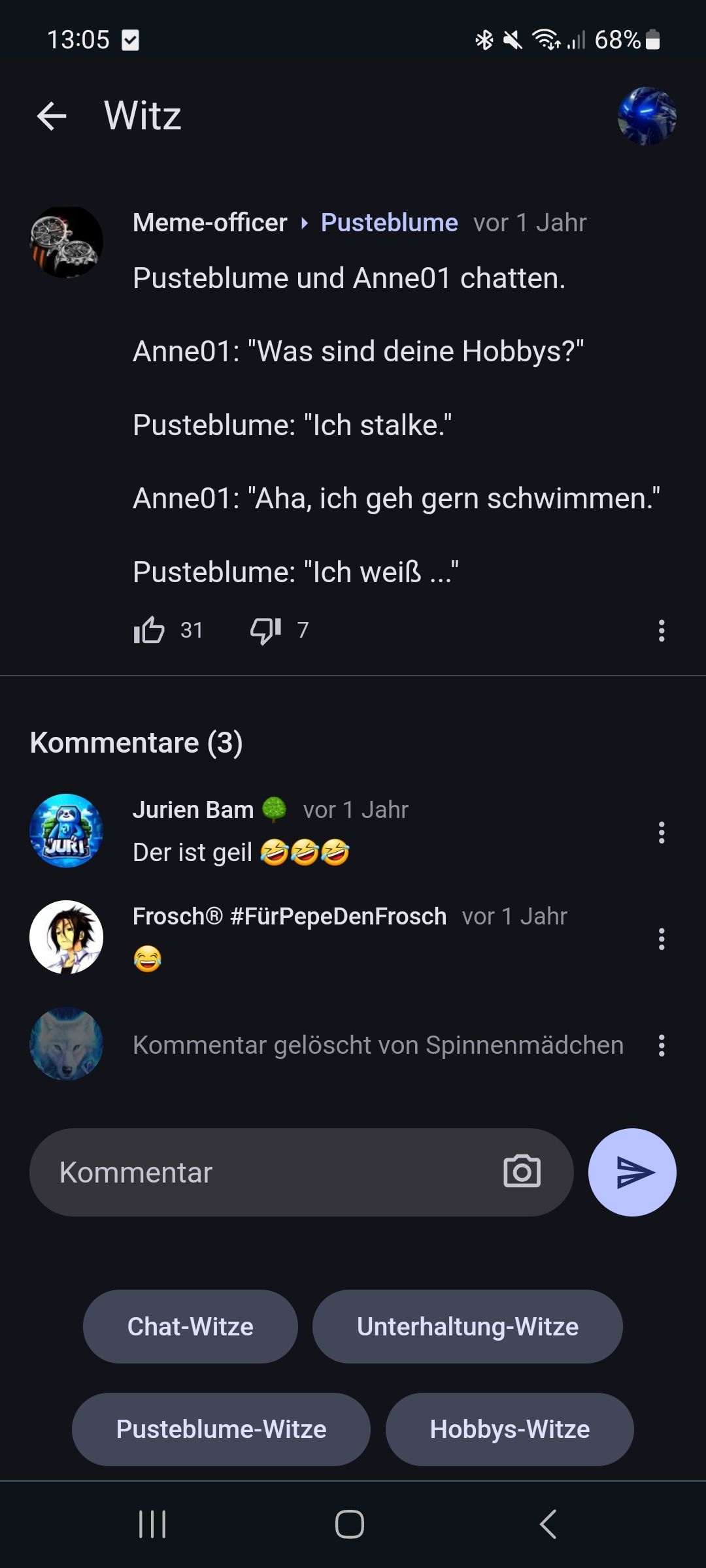 Ey, du Nuss! Der Witz ist so flach, da könntest du drüber stolpern! Es geht darum, dass jemand fragt, wer chatten will. Hast du überhaupt Freunde, mit denen du chatten kannst? Wahrscheinlich nicht, weil du so unlustig bist!