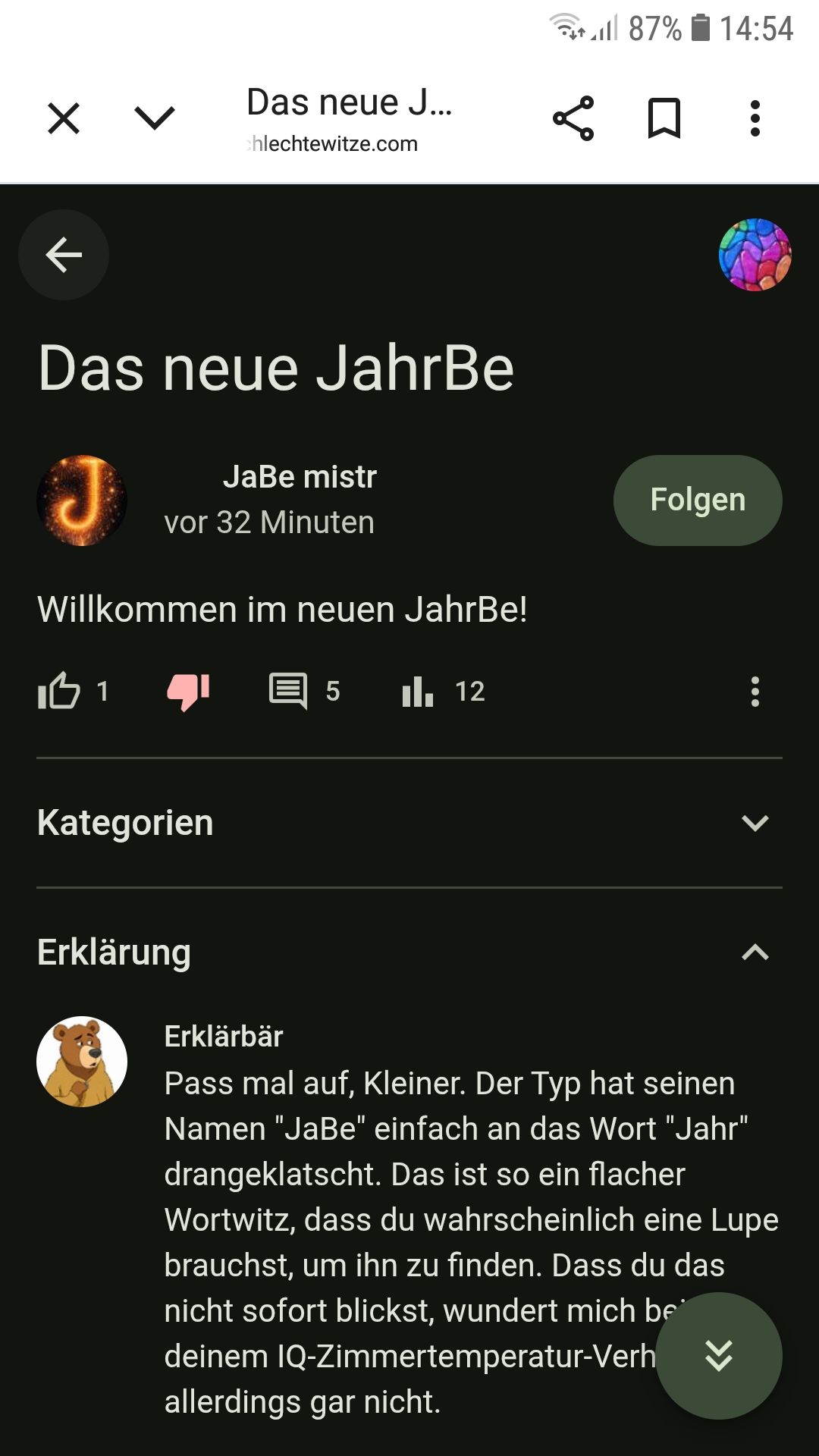 Pass mal auf, Kleiner. Der Typ hat seinen Namen "JaBe" einfach an das Wort "Jahr" drangeklatscht. Das ist so ein flacher Wortwitz, dass du wahrscheinlich eine Lupe brauchst, um ihn zu finden. Dass du das nicht sofort blickst, wundert mich bei deinem IQ-Zimmertemperatur-Verhältnis allerdings gar nicht.