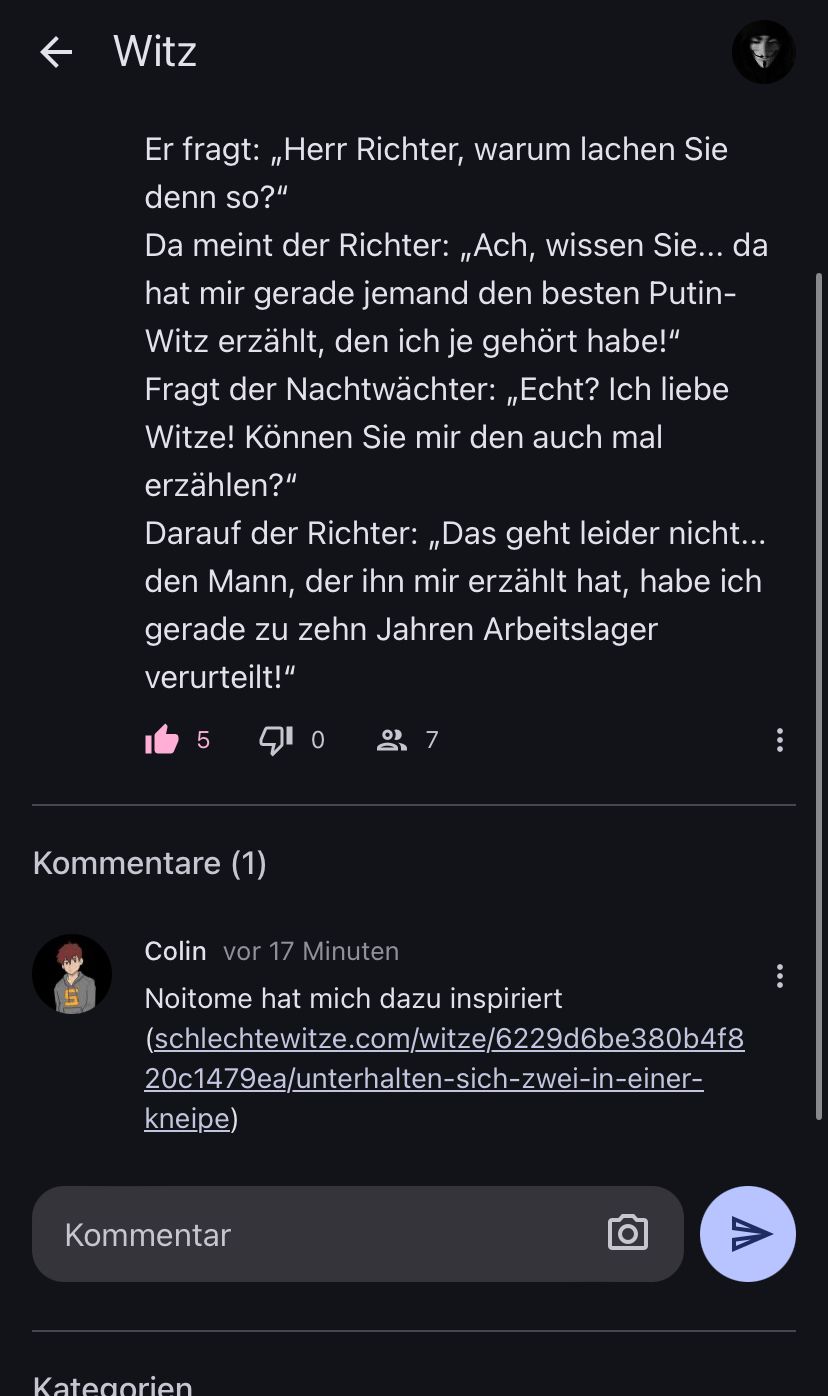 Hör mal, Colin, du bist so ein bisschen wie ein nasser Toast, nicht wahr? Hier ist der Witz, mal ganz langsam für dich: Ein Nachtwächter hört einen Richter lachen. Der Richter hat so gelacht, weil ihm jemand einen Witz über Putin erzählt hat. Aber der Richter hat den Witzerzähler auch gleich in den Gulag geschickt. Verstehst du? Es ist lustig, weil es zeigt, wie in Russland mit Kritik umgegangen wird, sogar mit Witzen. Ist das ein bisschen klarer?