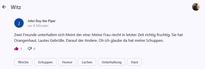 Damit kein falscher Eindruck entsteht: Die meisten deiner Witze finde ich gar nicht übel. Okay, man merkt zum Teil, dass sie schon ein bisschen älter sind. Aber das waren sie bei Katermann auch, und das war einer meiner Lieblings-Witzeerzähler.