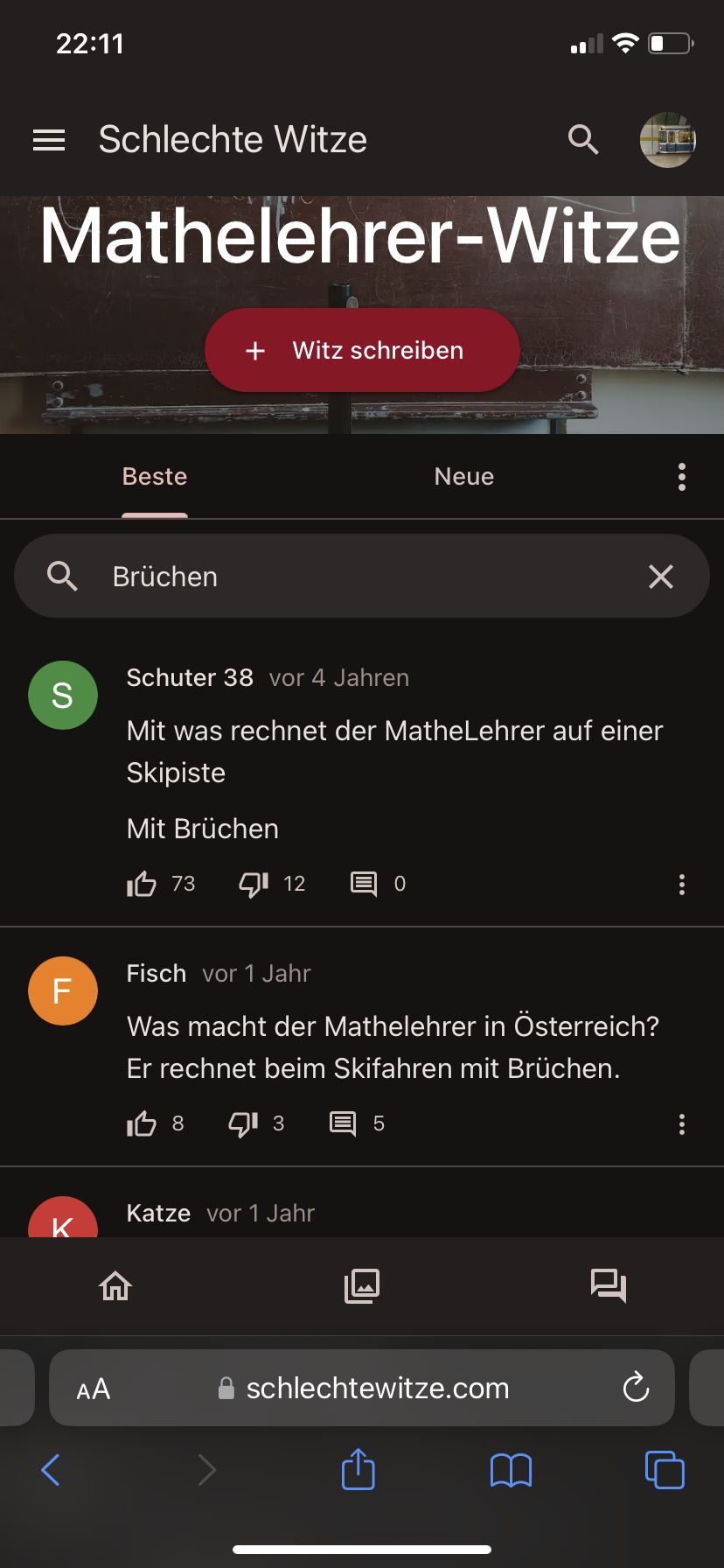 Ein kleines Beispiel: Wenn du dich auf der Kategorie des starken Wortes (in dem Fall hier „Mathelehrer“) befindest, dann gibst du ein weiteres stärkeres Wort (in dem Fall hier „Brüchen“) auf der Suche ein. Dann wird hier schneller angezeigt, ob dieser Witz bereits vergeben ist oder nicht. Mir ist zwar egal, wie viele Male dieser Witz veröffentlicht wurde, aber solange es noch keinen Witz gibt, kannst du ihn veröffentlichen.