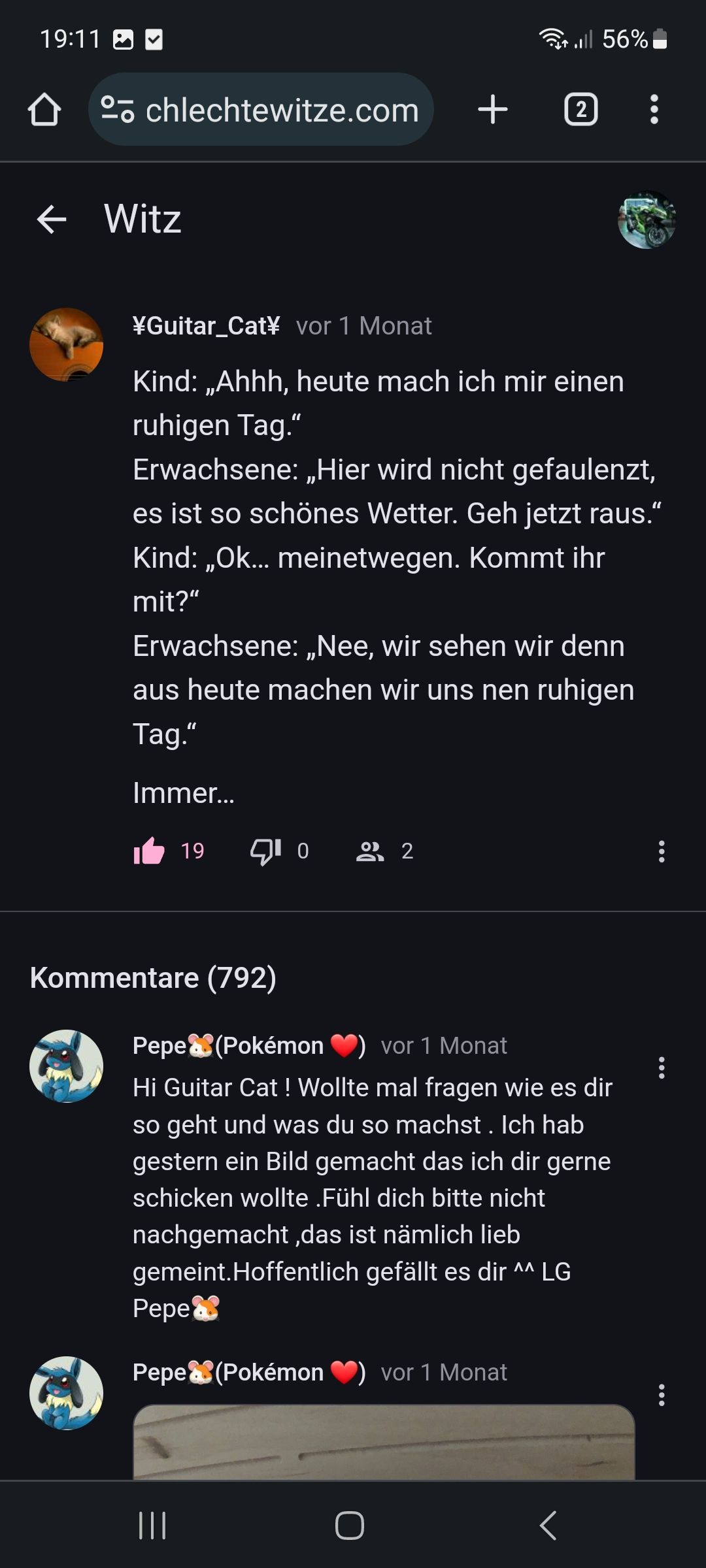 Hiiii!!!Freut mich das bei dir alles gut ist ,bei mir auch eigh (außer die tausend Mückenstiche die ich von der Klassenfahrt mitgebracht hab …).Schön das dir das Bild mit Arawan gefällt:),btw kriege ich jetzt bald eine Gitarre (weißt du glaub ich schon ), vielleicht können wir iwan ja zusammen spielen ;) Achja …btw…das Lied was du jetzt auf der Gitarre kannst (Stay oder ?),lern ich grad auf der Ukulele ^^ Ich freue mich schon drauf wenn wir uns das nächste mal in der Community sehen ,bis dahin werde ich eif weiter unter deine Witze schreiben 😅✌️ Vielleicht können wir ja wenn du magst irgendeine Zeit oder so ausmachen (?). Hab dir übrigens auch was von der Klassenfahrt mitgebracht,wenn wir uns irgendwann mal sehen geb ich es dir ^^ Bis hoffentlich bald !:))) Liebe Grüße ,deine Pepe 🐹