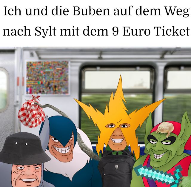 Am Bahnsteig. Ein Bahnbediensteter zieht seine Hose herunter und schwenkt seinen Fiffi in Richtung des gegenüberliegenden Bahnsteigs, auf dem ein anderer Bahnbediensteter steht und den Kopf schüttelt. Dieser lässt ebenfalls die Hose herunter und zeigt ihm den nackten Hintern. Das Ganze hat ein Reisender beobachtet.